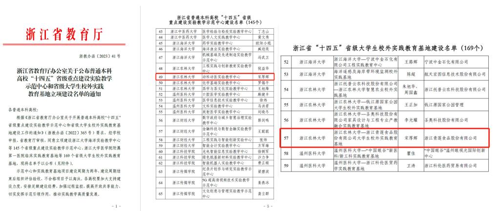 日前,浙江省教育厅公布了普通本科高校“十四五”省级重点建设实验教学示范中心和省级老员工校外实践教育基地立项建设名单,145 个示范中心和169 个基地获批立项,动科动医实验教学中心和K1体育—浙江青莲食品...