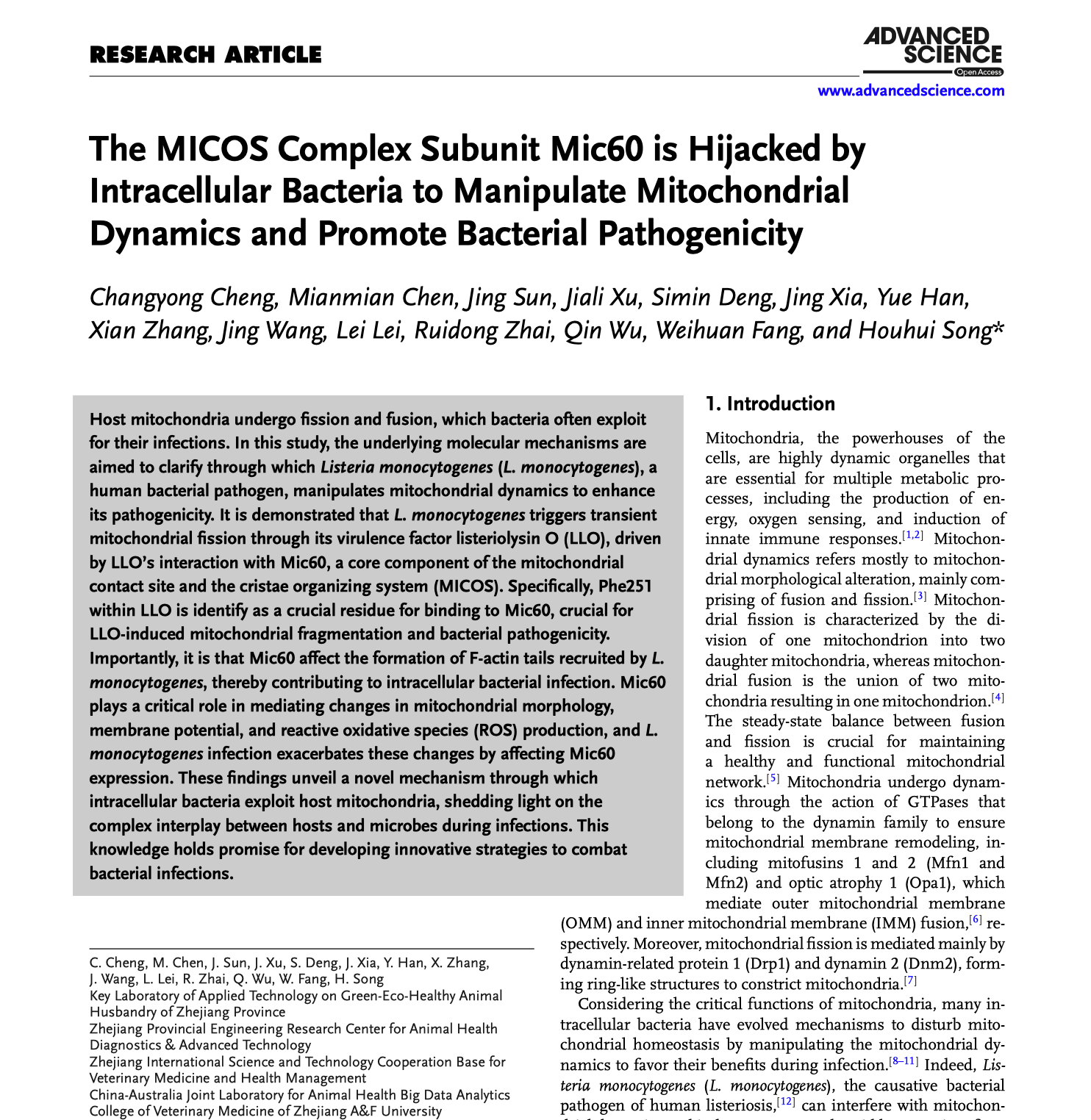 近日,动科动医公司同一健康与交叉前沿学科研究团队在国际权威期刊《Advanced Science》(中科院一区TOP期刊,IF5-year:16.3)发表了题为“The MICOS complex subunit Mic60 is hijacked by intracellular bacteria to manipulate mitochondrial dynamics...