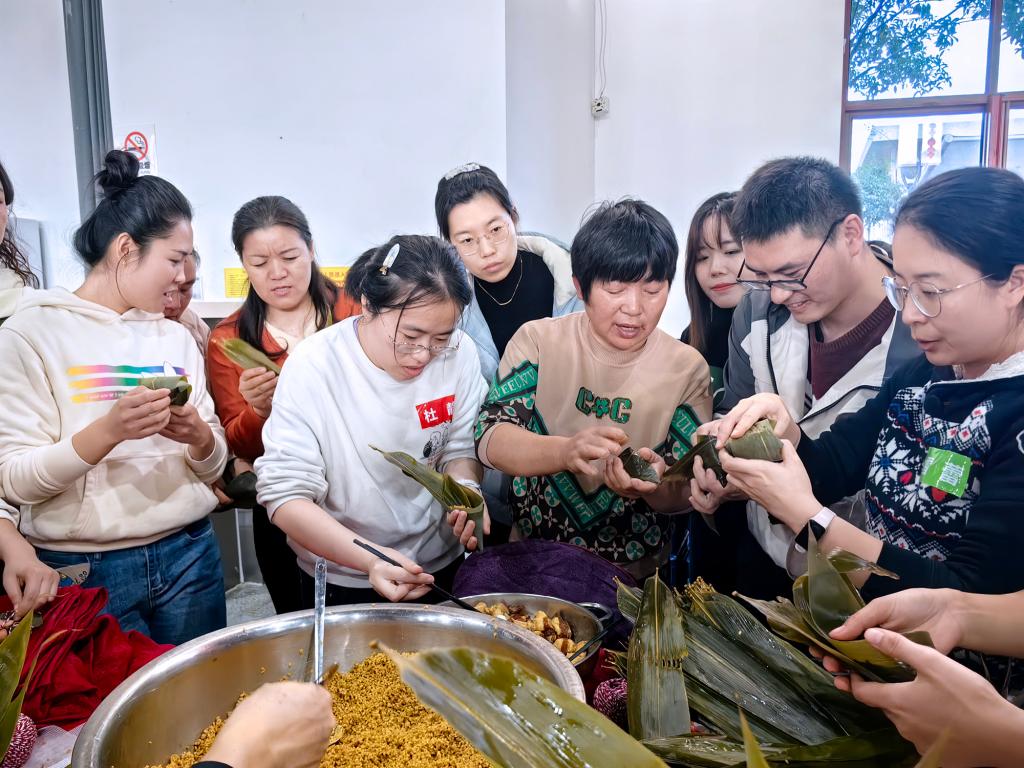 在包粽子环节中,大家一边交流南北方粽子的差异,一边挑粽叶、折粽叶、填糯米、放馅料、裹叶子、扎粽绳,个个动作娴熟、各施绝技,年青老师们也是边看边学、渐至佳境。大伙相互协作,不一会功夫,各式各样的粽子呈现在大家面前,有的方方正正有棱有角,有的细细长长又扁又圆,有的严严实实密不透米,也有的漏出米粒开口“笑”着。