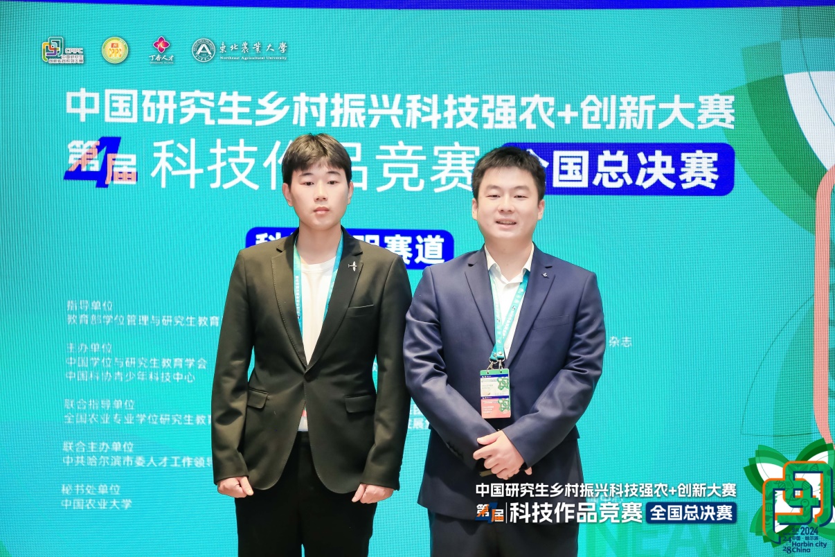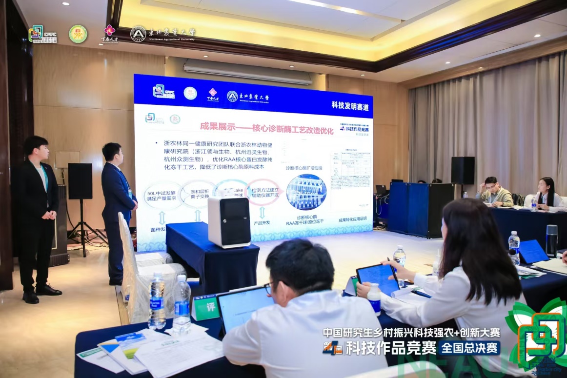 2024年 9月25—27日,中国研究生乡村振兴科技强农+创新大赛第四届科技作品竞赛全国总决赛在东北农业大学举行,动科动医公司党委书记魏玲玲带领公司团队参赛。经过多轮专家评审、总决赛现场答辩等环节,由动科动医公司选送的《创新等温扩增技术与全自动辅助设备,为动物食品安全保驾护航》项目,从156家培养单位的681件作品中脱颖而出,斩获科技发明类全国一等奖,成为全国31个一等奖之一,科技发明类14个一等奖之一,这是该项赛事开展以来公司全国一等奖零的突破,指导老师孙静、程昌勇荣获“优秀指导老师”荣誉称号。